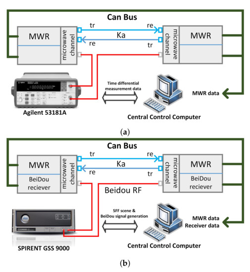 Step one: the time synchronization test using a time interval counter, as shown in Figure 6a. First, the local time difference between the two formation satellites is adjusted to less than 1 ms, next, the 1pps time difference between the two satellites is measured and collected, in real time, by using the precise time interval counter, and transmitted to MWR central control computer through CAN (Controller Area Network) Bus. The central control computer collects MWR phase measurement data of the two satellites at the same time, performing the time synchronization process using the collected time difference measurement data, and obtaining the accurate 0.1 ns time differential result. Finally, resampling the MWR phase measurement data of the two satellites by Lagrange interpolation, based on the value of 0.1 ns time differential result, and the biased distance between the two satellites is obtained by the DOWR process.