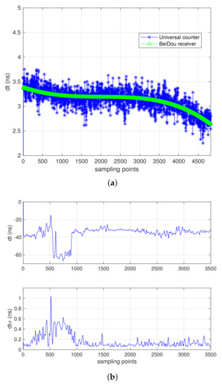 Here we provide the time synchronize results as in Figure 7, the experiment was performed within one-hour time in 8 April 2021, in static laboratory environment. The blue line and green line in Figure 7a denote the time differential data obtained from time interval counter and BeiDou receiver. The results demonstrated the consistent output of time synchronize performance the receiver can provide, within 0.1 ns after data analysis.