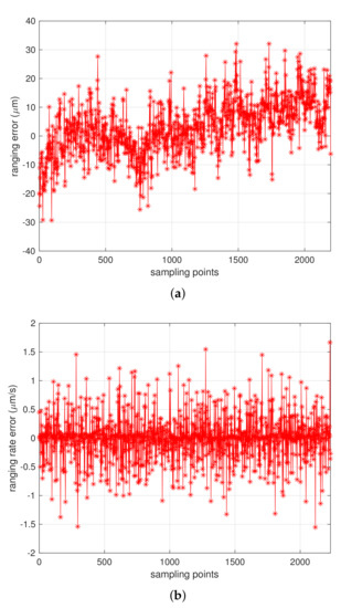 where c: the speed of light; : the transmit signals carrier frequency of satellite A and B (K/Ka); : the instantaneous range-rate; : the velocity component along the LOS vector; : the time-of-flight difference. On the basis of the magnitude and accuracy estimation to the instantaneous range correction related parameters, the final instantaneous correction accuracy that obtained through [32]: