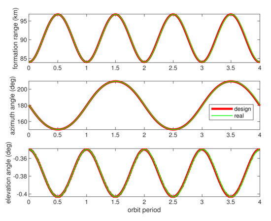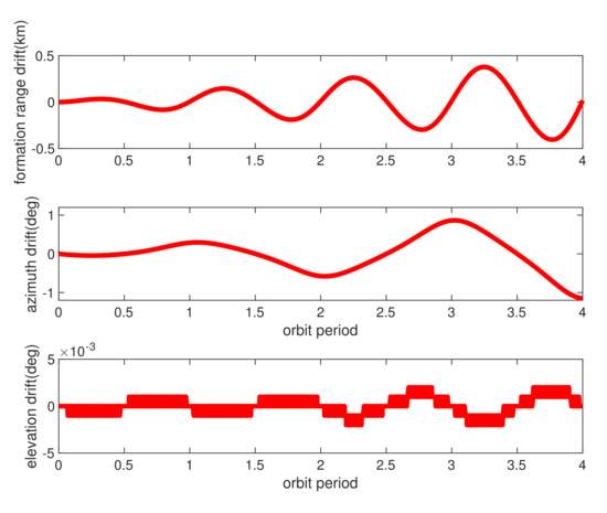 Formation range and azimuth/elevation angles bias under real orbit perturbations. The red lines represent the bias of real formation range drift from the designed values (top) and the azimuth/elevation angle drift (middle/bottom).