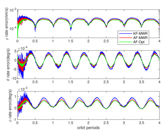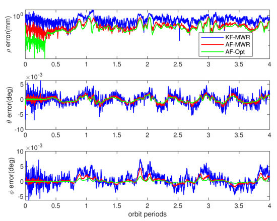 The BeiDou dual frequency carrier phase differential measurement was stable during the whole simulation time, by using traditional Kalman filter algorithm. The relative range estimation error (the differential of estimated values and real perturbed values from models of Table 3) achieves a maximum of 1.5 cm. The interesting results are the estimation error using MWR equipment, as shown in Figure 14 and Figure 15, while the blue lines denote the estimation error obtained from MWR, by using traditional Kalman filter. The ranging errors are below 1.3 mm during simulation, as shown in top of Figure 14, and ranging rate errors are within 1.2 m/s (top of Figure 15). It is worth noting that the relative range rate error changed periodically during simulation: the minimum error occurs during the farthest side of pendulum flight, and divergent gradually to the maximum values around the nearest points, at each orbit period. The reason for this phenomenon can be explained as: the Kalman filter is more sensitive to the changing of ranging rate, in the direction of line of sight (LOS), when the SFF flight around farthest side of pendulum movement, than the nearest side (equilibrium point of pendulum movement), and the same filter trend can also be found in elevation angle rate estimation error in bottom of Figure 15. This is due to the relative ranging errors introduced by orbit perturbation that dominated by the cross-track direction , and finally influence the range rate and elevation rate estimation results. However, the effect of perturbation for azimuth angle vanished, which greatly improved the accuracy of azimuth rate estimation error. The final results are within ± 5 deg/s during simulation, as shown in middle of Figure 15.
