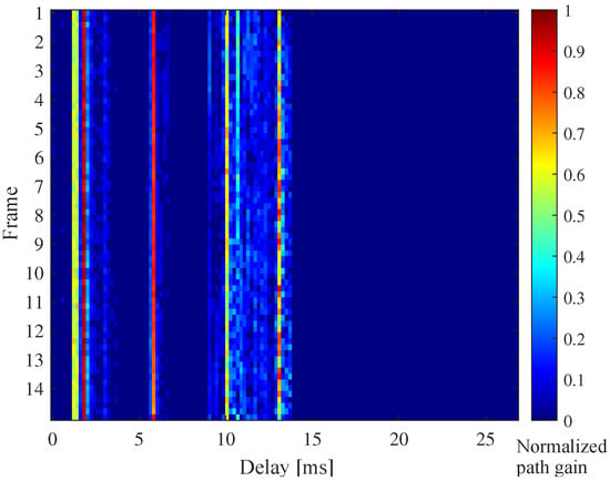 To further verify the proposed algorithms, a real lake experiment was performed at Huating Lake, Anhui Province, China, in May 2018. Huating Lake covers an area of about 70 square kilometers, with an average water depth of about 17 m. We hung the transmitter and receiver on the side of a passenger ship and a speedboat, respectively. The passenger ship has a semi-open roof and is about 10 m long, while the speedboat is about half the size of the ship. During the experiment, the transmitter depth was about 10 m and the receiver depth was about 13 m. Affected by wind and current, their relative speed was about 0.5 m/s, and the distance between them was more than 4.5 km. The parameter settings of the experiment are in Table 2. In addition, the linear frequency modulation (LFM) signal was added at the beginning and end of each frame for time synchronization and Doppler estimation. The transmitted data bits were encoded by a rate convolutional code, and the encoded bits were mapped by QPSK constellation. As showed in Figure 1, using the proposed NC-CSCE algorithm, we obtained the estimated CIRs for a 14 frame history with five consecutive OFDM blocks in one frame. The CIRs are estimated after Doppler compensation, and the total delay spread is around 15 ms. From the estimated CIRs, we notice that the paths are distributed in multiple clusters, and the channel shows a clustered-sparse structure.