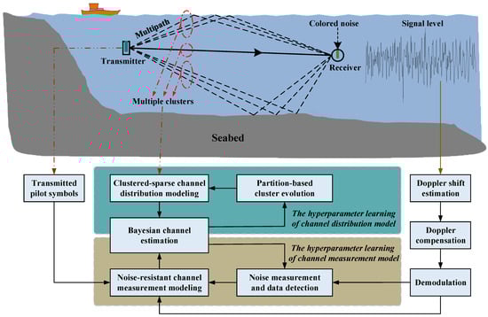 A typical UWA-OFDM communication scenario was shown at the top of Figure 2. The receiver can obtain the transmitted OFDM signal through dynamic multipaths, and the received signal may be affected by random colored noise. At the bottom of Figure 2, the system architecture of Bayesian learning-based channel estimation is given. To characterize the delay power spectrum and temporal correlation of each cluster in the UWA channel, the clustered-sparse channel distribution model is constructed and the model hyperparameters can be optimized by the iterative partition-based cluster evolution. Demodulated signal and pilot symbols were utilized to measure the instantaneous channel response, and the iterative noise measurement and data detection can improve the anti-noise performance of the channel measurement model. Based on the channel distribution model and the channel measurement model, the Bayesian channel estimation can be obtained.