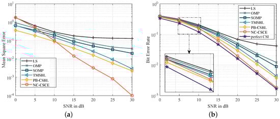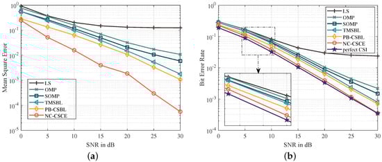 Figure 3a,b show the MSE and BER performance of different channel estimation methods, respectively. LS performs worst, because the channel sparsity is not considered for this underdetermined system. Based on the joint estimation of multiple OFDM blocks, the SOMP makes full use of the strong temporal correlation of path delays and achieves better performance than the OMP. The delay and correlation of path gains are analyzed in the TMSBL, which makes it better than the SOMP. However, the proposed PB-CSBL performs even better, as it can learn different temporal correlation coefficients and reduce the interference among clusters. The proposed NC-CSCE algorithm utilizes all received pilot and data symbols for the channel estimation, which achieves the lowest BER close to the perfect CSI. When 16-QAM mapping is adopted, Figure 4 proves that the proposed algorithms still maintain good estimation performance. However, in the low SNR region from 0 to 10 dB, the NC-CSCE algorithm does not perform well. This is mainly because high-order modulation at low SNR is prone to symbol decision errors, which may be exacerbated in the iterative process of the NC-CSCE algorithm.