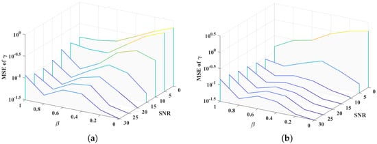 Then, to verify the estimation performance of the proposed algorithms under extreme temporal correlation coefficients (i.e., and ), the proposed algorithms are compared with their theoretical lower bounds. Multipaths are assumed to be sparse and share the same correlation coefficient. Then, under QPSK mapping and white Gaussian noise, the mean square error performance is presented in Figure 5. When , the MSE of the proposed algorithms is close to the theoretical lower bound in a high SNR region. A significant gap exists in the low SNR region, especially for the NC-CSCE algorithm. This is caused by imperfect hyperparameter estimation, as the lower bound is only reached when the perfect hyperparameters are obtained. When , the gap is more obvious in the whole SNR region because of the hyperparameter estimation error. However, the MSE performance with is better than the MSE performance with in a low SNR region. In short, a larger temporal correlation coefficient means stronger resistance to additive noise, however, the hyperparameter estimation error, such as the error of , is often larger than that of small temporal correlation coefficients in the high SNR region. Figure 6a,b show the MSE of the estimated by the proposed PB-CSBL and NC-CSCE algorithms, respectively. The MSE is evaluated under different SNRs and temporal correlation coefficients. As can be seen, a larger temporal correlation coefficient achieves a smaller MSE in the low SNR region, while a smaller temporal correlation coefficient reduces the MSE value in the high SNR region.