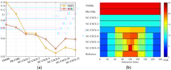 Finally, to evaluate the estimation performance of the proposed NC-CSCE algorithm under colored noise, we compared the NC-CSCE algorithm with the TMSBL and PB-CSBL algorithms. The group number of subcarriers in NC-CSCE is adjusted to evaluate the channel estimation performance. In the simulation, all paths are distributed in three non-overlapping clusters. The clusters are set with three different temporal correlation coefficients ranges over multiple OFDM blocks, which are , , . All subcarriers are divided into eight groups and each group is set with a different SNR. As shown in Figure 7b, the reference SNR ranges are from 5 to 20 dB. With QPSK mapping, the MSE and BER performance curves are shown in Figure 7a, and the results prove that the proposed NC-CSCE algorithm is superior to the TMSBL and PB-CSBL algorithms. The NC-CSCE-8 denotes the NC-CSCE algorithm with eight groups, and it performs better than the NC-CSCE algorithm with other groups. Therefore, the setting of group number is critical for the NC-CSCE algorithm. In one instance, the actual distribution of colored noise can hardly be reflected with a limited group number; yet in another, a small symbol number will result in low measurement accuracy in one group. Figure 7b also shows the statistical results of the estimated SNRs based on 500 simulations. Similarly, NC-CSCE-8 matches the reference best among all compared methods.