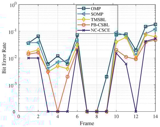 Figure 8 shows the BER performance after convolutional decoding. The BERs of the proposed two algorithms are still the lowest for most frames, followed by the TMSBL and the SOMP, while the OMP has the worst BER performance. Obviously, the performance gap between proposed algorithms and other methods further verify the superior performance of the proposed algorithms.