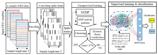 - Doborjeh, M.G.; Wang, G.Y.; Kasabov, N.K.; Kydd, R.; Russell, B. A spiking neural network methodology and system for learning and comparative analysis of EEG data from healthy versus addiction treated versus addiction not treated subjects. IEEE Trans. Biomed. Eng. 2015, 63, 1830–1841. [Google Scholar] [CrossRef]