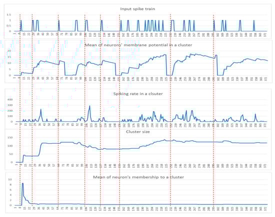 In an SNN model, the input information is propagated from input neurons (sources of information) to other neurons. At the beginning of the STDP learning in the SNN model, only the input neurons (centroids of the clusters) have received the information (. When the learning procedure increments with sets of spatiotemporal streams over time, the other neurons will also receive a ratio of information from one or more input neurons. Therefore, neurons are being clustered with respect to the amount of information that they receive from each of the inputs. In such a way, neural clusters are created and evolved over time in an incremental way during STDP learning.