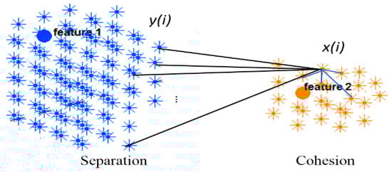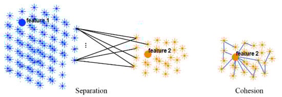 Two clusters of neurons in an SNN model were generated, each of which was associated with one EEG variable acting as a cluster center (input feature allocated to an input neuron). Cohesion measures how related the neurons are in a cluster through averaging the connection weights in the cluster, while separation measures how distinct a cluster is from other clusters through averaging the connection weights between the clusters.