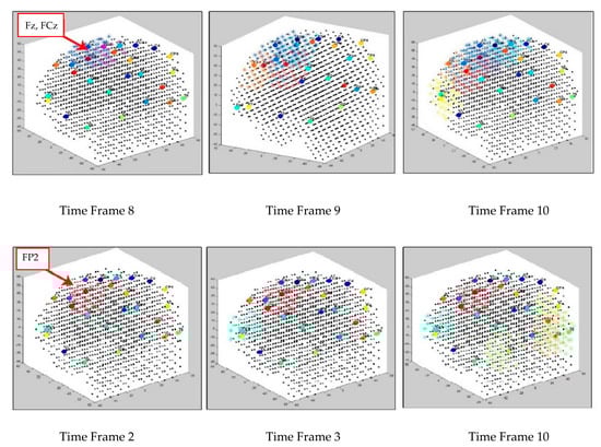 As seen in Figure 14, the extracted patterns/events from the SNN improve the model explainability by demonstrating where (space) and when (time) a trajectory of frequent behaviors (spike-event actions) take place in the models of brain data from the addictive group versus the control group. Such spatiotemporal patterns may occur in distinct brain regions at certain times, and they can be represented as a set of spatiotemporal rules. The knowledge extracted by the OP group can be compared with control group to reveal the affected brain areas and functions by addiction. For example, it can be seen from Figure 14 that the SNN models produced a greater number of spike-event actions (shown in red boxes) over time in several spatial positions including FP2, F3, F7, and Oz in OP group than the control group. Two symbolic representations of the rules for control group ( and OP group ( are defined as follows, where defines the order of the time interval when maximum events are detected: