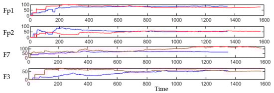 The dynamic patterns of the mean of PSP rates (an example of four clusters corresponding to Fp1, Fp2, F7, and F3 variables) during the learning process with EEG samples from the control class (in red) and OP class (in blue).