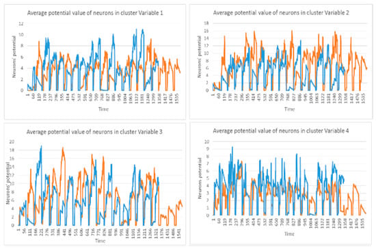 This section evaluates the dynamic spatiotemporal clustering through measuring how a cluster’s member (neuron) fits into its own cluster compared to other clusters. Since there was no class label information at the STDP unsupervised learning phase in the SNN model, here we employed an internal measurement technique, called silhouette coefficient validity method. This validity measurement is based on the “cohesion and separation” concept [,] graphically shown in Figure 4 for two adjacent clusters extracted from the SNN models from Figure 3.