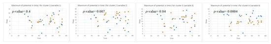 The local maximum of the potential for four clusters (corresponding to Fp1, Fp2, F7, and F3 variables) that are plotted as dots in time t for all the EEG samples in two classes: control class (red) and OP class (blue). The values can show the level of difference between the two classes (control and OP) in the EEG variables with -value < 0.05 (measured by a t-test). The EEG variables with high p-value are not statistically significant.