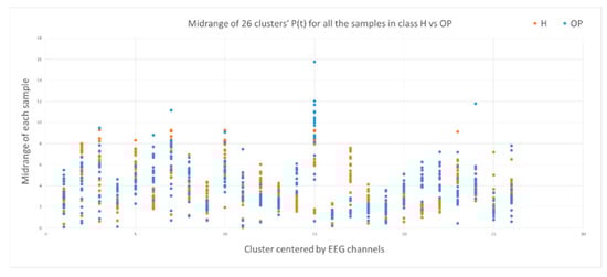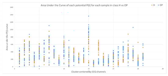 This section illustrates the explainability of the SNN models and investigates the knowledge stored in the SNN models through analyzing the trends of clusters creation. The time series were analyzed to reveal how the SNN-based dynamic clustering could be useful to discriminate the EEG data samples across different classes. Here, the dynamic patterns were captured for all the 26 clusters during the STDP learning process in SNN models with EEG data of two classes of participants (control subjects and opiate addicts). Figure 8 depicts an example of dynamic visualization for only 10 clusters (related to 10 EEG electrode) in control and OP groups. These patterns were investigated through computing the peak of potential () (shown in Figure 9), area under curve (Figure 10), and midrange of potential (Figure 11). Figure 9 shows that for each EEG sample, the peak of potential () is plotted as a dot at time . This potentially separates the samples across the classes with different degree of discrimination in the EEG features with .