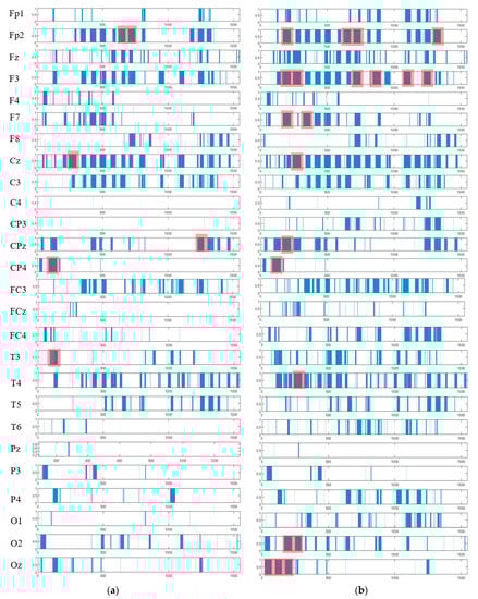 The spatiotemporal spike events (shown in blue bars) are extracted from the PSP patterns (shown in Figure 8) to demonstrate (when) and (where) the neural spike events (denoted as action A) occurred in different groups (control in (a) and OP in (b)). These spikes are events that occurred at different spatial brain regions (neural clusters around EEG channels) and at different times during the STDP learning process with EEG data. In each cluster, the spike events correspond to significant changes in the values of PSP pattern that exceed the spike-emitting-threshold. This allows to investigate which areas of the brain were activated at what time for control vs. OP groups. The red boxes illustrate the spike-event actions, described in Section 3.4.