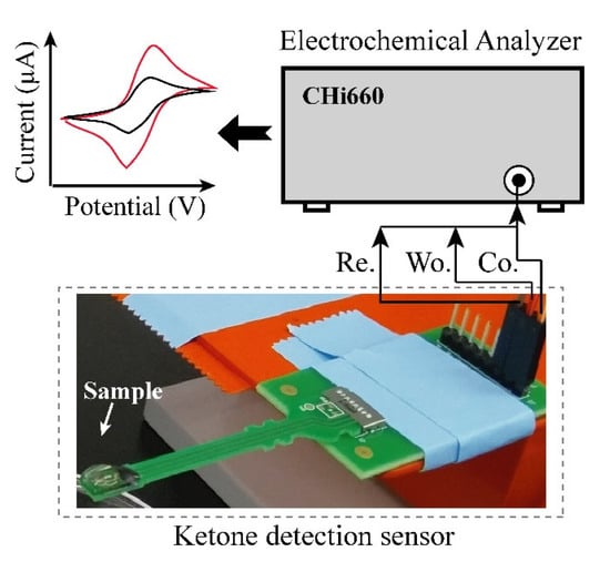 Electrochemical biosensor has substantial attentions in terms of their superior sensitivity, quick response time, as well as their potential application of rapid online analysis [1,2,3,4]. They can analyze a wide range of analyte molecules that can be detected easily using the surface modification process according to the analyte of interest [5,6]. Since an oxygen electrode was first developed for detection of glucose [7], many efforts have been performed to develop different types of biosensors in order to diagnosis disease [8,9]. Specifically, electrochemical biosensors for monitoring glucose and ketone bodies have been developed as a purpose of managing the diabetic patients [10,11].