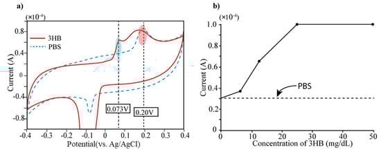 (a) Measurement of current level of 3-HB (mixed with PBS) and PBS using cyclic voltammetry (CV). Two current peaks appear in current level of 3-HB solution both 0.073 V and 0.25 V. Since PBS has single current peak at 0.25 V, the current peak at 0.073 V can be generated by 3HB. (b) The 3-HB solutions with different concentrations (0, 6, 12.5, 25, 50 mg/dL) were prepared by dilution using PBS and performed CV measurement. The current peaks of five different concentrations of 3-HB at 0.073 V were displayed.