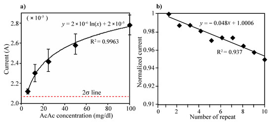 (a) Changes of current level according to the concentration of AcAc. Five different concentrations of AcAc (6.25, 12.5, 25, 50 and 100 mg/dL) and PBS (0 mg/dL) were prepared and performed CV measurement. Then, 80 µL of each prepared sample were added on the electrode and the current was measured at the applied potential of 0.073 V. The limit of detection (LOD) was defined as the lowest detectable signal from 2-sigma standard deviation above the mean current value at 0 mg/dL of AcAc solution. The enzyme-modified electrode can detect AcAc down to 6.25 mg/dL (sensitivity) and up to 100 mg/dL, (b) Ten repeated CV measurements and washing test were performed using 50 mg/dL of AcAc solution. All the measured current levels were normalized by first measurement.