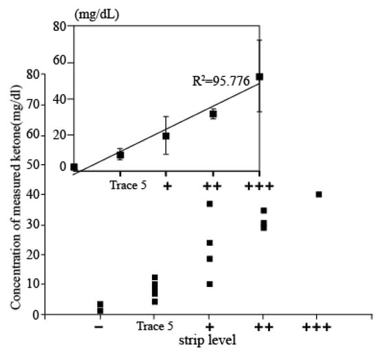Associated plot between the electrochemical sensor and the dipstick methods acquired from 20 patients. x-axis presents ketone level detected by strip and y-axis shows ketone level measured by developed electrochemical sensor.