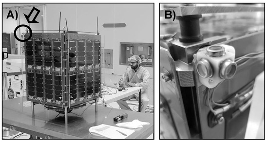 (A) UPMSat-2 at satellite at the Centre Spatial Guyanais of CNES (Kourou, French Guiana). February 2020. (B) SS1 sun sensor set, composed of three photodiodes. Pictures courtesy of Instituto Universitario de Microgravedad “Ignacio Da Riva”, Universidad Politécnica de Madrid.