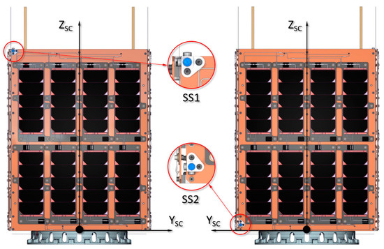The UPMSat-2 satellite, whose geometric shape is an orthohedron with dimensions of 450 mm × 450 mm × 600 mm, is equipped with a sun sensor formed by two sets of photodiodes (SS1 and SS2) located at the vertices of the main diagonal of coordinates XSC = 225, YSC = −225, and ZSC = 600 for the SS1 set, and coordinates XSC = −225, YSC = 225, and ZSC = 0 for the SS2 set, with respect to the satellite coordinate system (XSC, YSC, and ZSC) and supported on the panels (X+ and X−) that fix the solar cells, as shown in Figure 2. The sets are located on opposite corners of the satellite, to ensure that at least one of them is illuminated by the Sun, regardless of the satellite’s attitude within the orbit.