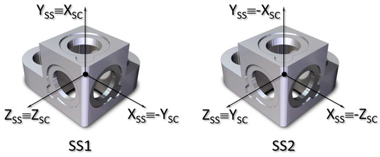 Solar sensor reference system (XSS, YSS, and ZSS) and its correspondence with the satellite reference system (XSC, YSC, and ZSC) for the SS1 sensor and the SS2 sensor, respectively.
