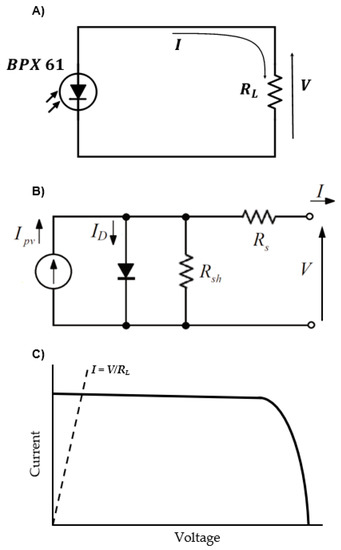 In order to choose the most suitable value of the resistance RL, it is necessary to know how a photodiode performs and, if possible, to model its performance, as this will also help to predict its behavior in orbit. There are different models to approximate the electrical behavior of a photodiode. Among them, the 1-Diode/2-Resistor equivalent circuit model was selected, see Figure 6B. It is basically composed of a current source connected in parallel with a diode, together with a shunt resistance Rsh, and a series resistance Rs [16,17,18,19]. Using the Shockley model for the diode, the output current, I, and the output voltage, V, at the terminals of the photodiode are related implicitly by the following equation: