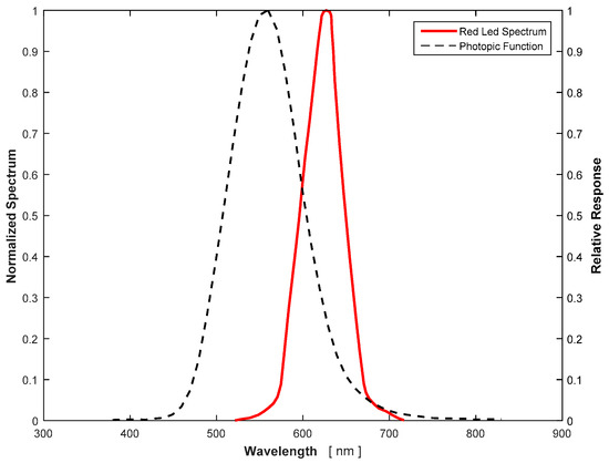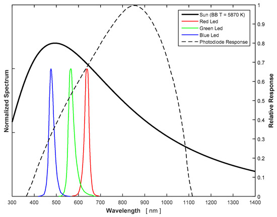 The light sources considered were solar, halogen, incandescent, and light-emitting diode (LED) illumination. However, natural solar light was discarded to avoid uncertainties due to atmospheric absorption of certain wavelengths, and in favor of a more controlled environment in the laboratory. Among the rest of the sources, red LEDs were selected as the best option in terms of cost and due to their well-known spectrum, which is included in the manufacturer’s datasheet. Additionally, halogen was used as a secondary source of light in order to validate the results independently. The peak response of the UPMSat-2 photodiodes is in the near-infrared region of the spectrum (see Figure 7), therefore, infrared LEDs could have been a better selection. However, the available instrumentation to measure the irradiance level reaching the photodiode sensor indirectly, a CEM-DT 1308 lux meter [21], only measures in the visible light range. Red light is, therefore, a tradeoff source that can be measured with a lux meter and still provides a significant response of the photodiode.