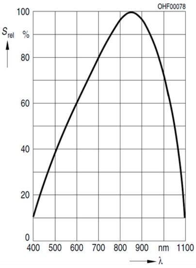 where As is the normal sensitivity area of the photodiode (this information is provided by the manufacturer, see [22]). However, not all the irradiance that reaches the photodiode is transformed into electrical power, as there is an efficiency associated with the process. The effective radiant flux Φeff the sensor converts into current can be obtained by using the spectral radiant flux, Φλ, and the normalized spectral sensitivity function of the sensor Ŝλ, which is provided by the manufacturer (see Figure 9):