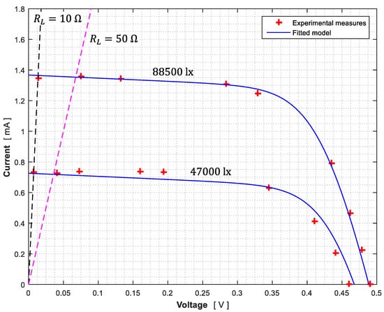 For each illuminance condition of Table 1, the mean values of both sets of measurements, and a solid line representing the fitted model corresponding to Equation (1), have been plotted in Figure 10. The parameters of these fittings are included in Table 2. As seen in the figure, the fitted model seems to reproduce approximately the photodiode response. Additionally, the dotted lines represent the possible working region of the photodiode in which the value of the resistor is kept between RL = 10 Ω and RL = 50 Ω.