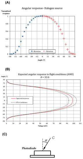 (A) Response of the photodiode SS1-X+ directional test. (B) Expected angular response of the photodiode SS1-X+ in AM0 spectrum. (C) Sketch of the photodiode under the irradiance, G, at angle α.