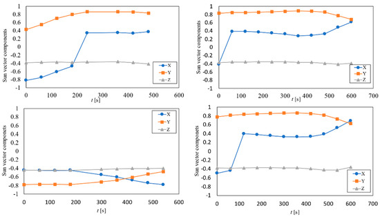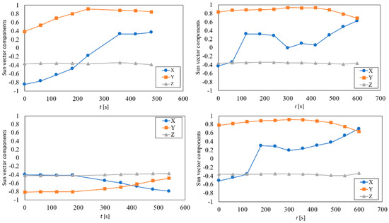 The results from UPMSat-2 data within the first three days of the mission (4th to 6th September 2020) are included in Figure 13. In this figure, the calculated Sun vector for four different accesses is represented. In each graph, the evolution of the different components of the measured sun vector in relation to the access time are shown. The results obtained show that the performance of the solar sensors is poor when the incidence angle is grater that 65°. Concerning the results obtained from the z-axis, a constant orientation of the satellite in relation to the Sun is shown, the angle of that axis being αz ∈ (110°, 117°) based on measurements from the sun sensors. It should be emphasized that considering the error foreseen by the UPMSat-2 ADCS with regard to the perpendicularity of its z-axis in relation to the orbit’s plane, results are in quite good agreement with the theoretical average value within a year, αz = 112.5°. However, the angular velocity of the spacecraft is left unknown, as the measurement rate is not fast enough to infer the angular velocity. In Figure 14, the results obtained if albedo noise is removed from the measurements are included. The contribution of the Earth albedo radiation is relatively small compared to the solar radiation. Nevertheless, the inclusion of this effect enhances the result obtained when the Sun falls at large angles (relative to the sensor normal direction) as can be seen when both figures are compared.