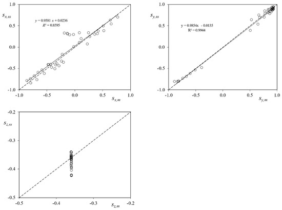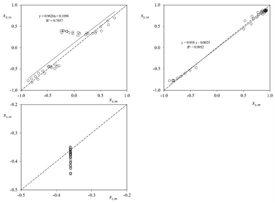 Albedo filtered sun direction coordinates with regard to the UPMSat-2 reference system. Coordinates based on the sun sensors system (sx,ss, sy,ss, and sz,ss) vs. coordinates based on the magnetometers of the satellite’s ADCS (sx,m, sy,m, and sz,m).
