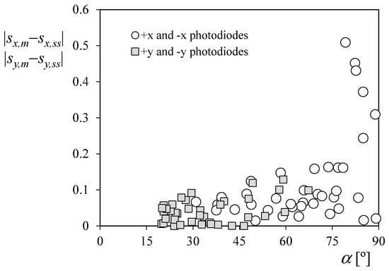 Differences between x-axis and y-axis coordinate values of the Sun direction based on the sun sensors system (sx,ss, sy,ss, and sz,ss) and on the magnetometers of the satellite’s ADCS (sx,m, sy,m, and sz,m) vs. the computed angle with regard to the corresponding illuminated photodiode using magnetometer data, α.