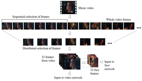 For the face network input, face areas were detected in each video frame by using the cascade classifier feature of OpenCV (https://opencv.org/ accessed on 7 June 2021) 4.2.0 version. The images were cropped and resized for the network input. Music video frames may or may not have a face in them, or may depict more than one face. We chose music videos that contained at least one face. In each video, video frame vt may contain one face {f1}, more than one face {f1, f2, f3, …, fm}, or no faces. After processing all of the video frames, we counted all of the frames containing faces. If the number of face frames was less than the face network input size, we repeated these frames until satisfying the requirement. Additional frames were discarded if the total face frames exceeded the neural network input. The repeated frames and discarded additional frames lost the temporal information of video sequences of faces. This is one reason for why our face network had a relatively small contribution to the overall decision making compared to the video and music networks.