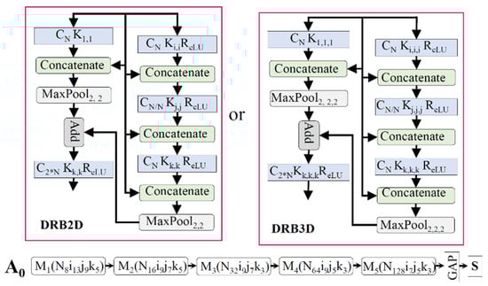 The block diagram of the proposed music video emotion classification network A0 with the 2D/3D convolution. The acronyms DRB2DSC and DRB3DSC are detailed views of the dense residual block with the standard 2D and 3D convolution for the music network and the video/face network, respectively. The symbol A represents the network architecture, M represents the dense residual block defined in the detailed view, S represents the Softmax function, GAP is global average pooling, and MMTM is the multimodal transfer module. Similarly, the symbols N, i, j, and k with values in the lower case represent the values of the items, as illustrated in the respective detailed views.