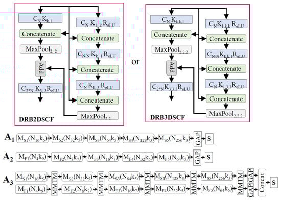 The block diagram of the proposed music video emotion classification network using slow (A1), fast (A2), or slow–fast network with MMTM (A3) and with the separable channel and filter convolution. The acronyms DRB2DSCFC and DRB3DSCFC are the detailed views of the dense residual block with 2D and 3D separable channel and filter convolution for the music and video/face networks. The symbols have the same meanings as the symbols in Figure 3.