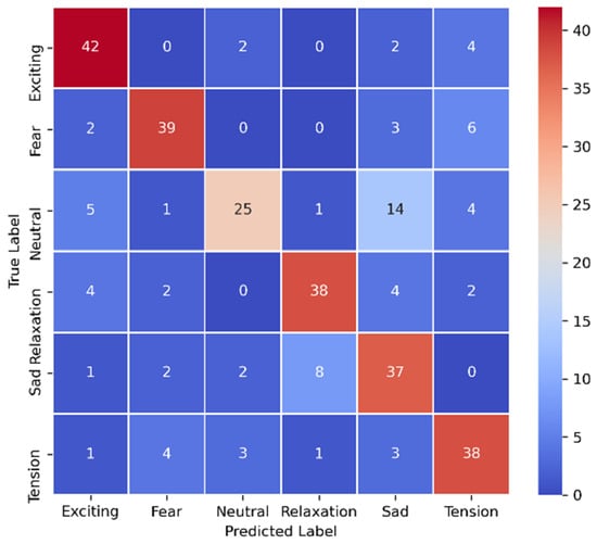 We validated the results of our experiments by using two visual evaluation methods: a confusion matrix and a ROC curve plot. The confusion matrix counted the number of samples in classes that were confused with each other. The confusion matrix in Figure 5 shows that the “Neutral” class was highly confusing for our classifier because it held data that were similar to those of more than one class. The classifier result showed confusion on the samples from the “Fear” and “Tension” classes because both classes held similar music structures (mostly rock and metal music). The rock and metal music samples also had common visual characteristics, such as angry facial expressions, dark backgrounds, and unique gestures and appearances. This number of commonalities confused the classifier. The “Sad” and “Relaxation” music videos had a similarly silent nature, so the classifier also confused these classes.