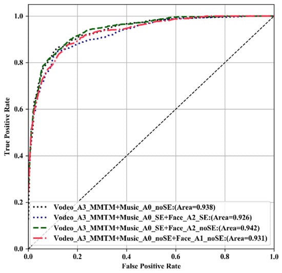 The ROC curves obtained when using our various multimodal architectures are shown in Figure 6. The multimodal architecture with music, video, and facial expression information performed the best. All of the classifiers showed similar ROC curves, with a small difference in the area under the curve (AUC) scores. Networks with similar performance and relatively fewer parameters obtained higher ROC-AUC scores.