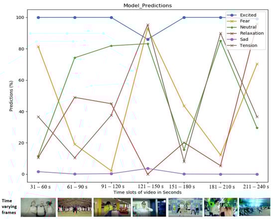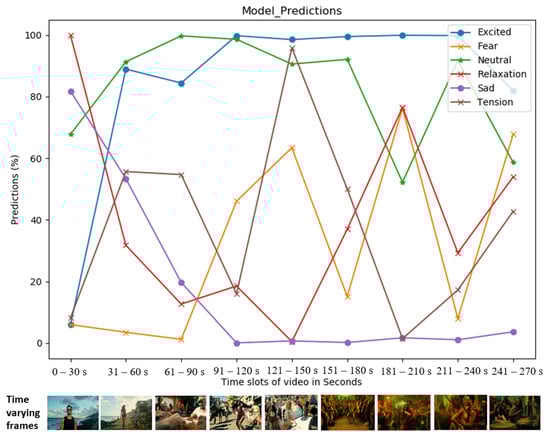 An emotional relationship between consumers and music videos was shown in [,,] to be cross-culturally essential for promoting a song or album. We present the results of our best-performing network on two music video with billions of views on YouTube at the time of writing. The prediction results for Despacito (https://www.youtube.com/watch?v=kJQP7kiw5Fk) (accessed on 7 June 2021) (7.41B views) and Gangnam Style (https://www.youtube.com/watch?v=9bZkp7q19f0) (accessed on 7 June 2021) (4.10B views) are shown in Figure 7 on the left and right, respectively. The prediction results (in percentages) for each class are illustrated with individual curves depicted across 30-second increments. We used the sigmoid activation function to find the correlation of our six emotional categories. The highest-activated class is illustrated with the highest score, and the second or third most probable classes are further down on the vertical axis. One video frame is illustrated at the bottom according to the time for illustration, but the musical components were also responsible for the final decision.