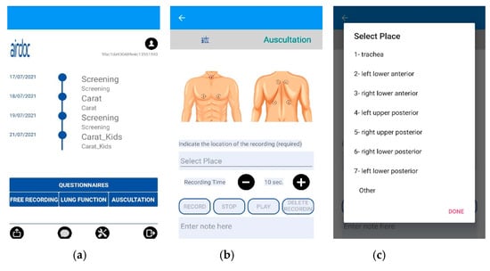 AIRDOC app screens used: (a) main screen; (b) lung auscultation feature; (c) location selection.