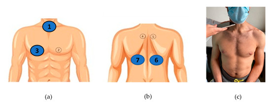 CORSA locations for lung sound recordings: (a) trachea (1) and right anterior chest (3); (b) right and left posterior bases (6 and 7); (c) example of a sound recording at the trachea during a medical appointment.