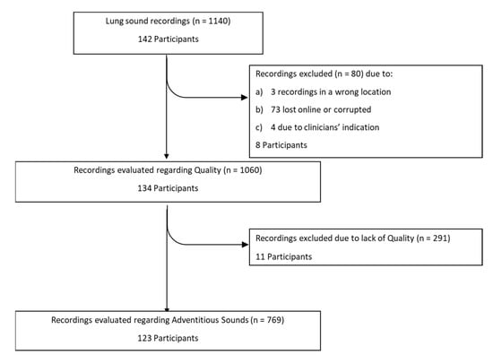 The following are available online at https://www.mdpi.com/article/10.3390/s21144931/s1, Table S1. Inter-rater agreement regarding the quality classification and the presence of adventitious sounds by location, age group and diagnostic group. Table S2. Proportions of participants with recordings with quality, recordings with adventitious sounds, and stethoscope identified adventitious sounds by location, age group and diagnostic group. Table S3. Comparison of the proportions of participants with recordings with quality, recordings with adventitious sounds, and stethoscope identified adventitious sounds between age group or diagnostic group. Table S4. Comparison of the proportions of recordings with quality with adventitious sounds between auscultation location, age group or diagnostic group. Table S5. Comparison between the findings of conventional auscultation and smartphone auscultation regarding the participants and the recordings.