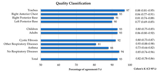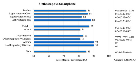 When considering recordings as unit of analysis, the comparison between conventional and smartphone auscultation evidenced a low kappa (0.35), despite having a high percentage of agreement (85%). Regarding the auscultation location, the percentage of agreement was similar across all four groups (82–88%), while the inter-rater agreement ranged 0.052–0.46, with the trachea having the lowest value of kappa (k = 0.052). Concerning the age group, both groups had a similar percentage of agreement (87% and 81%, respectively) and inter-rater agreement (k = 0.35 and k = 0.34). Finally, in terms of diagnostic groups, the group with other respiratory diseases had a percentage of agreement of 81% and the greatest inter-rater agreement (k = 0.53), while the CF group, with a percentage of agreement of 83%, had a close-to-zero value of k = 0.094. In the group with no respiratory diseases and in the asthma group (90% of agreement in both), the Cohen’s Kappa could not be calculated because the stethoscope’s classification had no positive findings. The results can be found in Figure 6. The results can also be found in Supplementary Table S5.