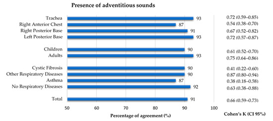 Finally, the agreement (percentage of agreement, k) between the two auscultation methods (conventional vs. smartphone) was explored, i.e., the agreement regarding presence/absence of adventitious sounds between clinicians notes and annotation through lung sound recordings. Two approaches were used: (i) for each age group and diagnostic group, participants were the units of analysis; (ii) for each location, age group and diagnostic group, recordings as units of analysis.