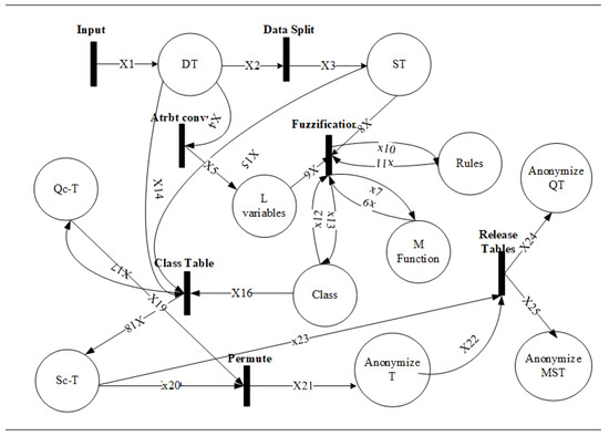We formally validate the working of the F-Classify algorithm along with its properties. To achieve the formal analysis, HLPN and Z3 languages are used. The HLPN model has been transformed into SMT-Lib [44] together with the correctness properties to illustrate the correctness of the F-Classify algorithm. Properties are then executed via the Z3 solver to verify their correctness. In HLPN, the algorithm was first presented in terms of its mathematical properties. These attributes are first translated into SMT-Lib to see if they are valid, and then they are executed through the Z3 solver. In [44], the formal definitions of SMT and Z3 solver are presented. The notations used in this section are represented in Table 6. Figure 3 depicts the HLPN for the F-Classify algorithm. Table 7 defines the variable types that were used and their explanations. The places and descriptions included in the HLPN F-Classify algorithm are shown in Table 8. The transitions have been labeled as Input in Figure 3. The first Input transition is a raw data table with m attributes and n records of patient electronic health records (EHRs) stored in the place DT. In the input transition, a raw data table with m attributes and n records is given, which is subsequently separated into different QI and SAs subsets using the Dsplit function. In Equation (8), the entire data split procedure is shown. All m attributes are then translated into linguistic variables lv in (9).