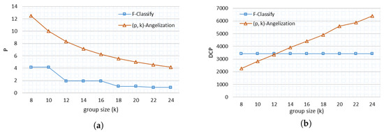 We used fuzzy logic with multi-dimensional partitioning in our methodology, which fuzzifies and distinguishes records. We can observe in Figure 4b that DCP grows with increasing group size in the case of (p, k) angelization, but DCP remains the same in the case of F-Classify. We have different group sizes in one table in F-Classify, as seen in Table 3a. We have one tuple in one class/group and five tuples in the other class/group, giving us 1, 5, 6, and 1 group sizes in one table while maintaining DCP. As a result, DCP has a smaller value in F-Classify than (p, k) angelization, where DCP increases with the increase of group size.