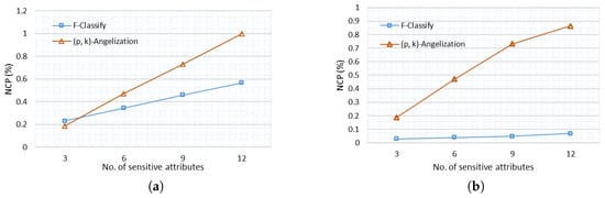 where y and z are the range of tuples defined after classification of table T, and A is the attribute for which NCP is calculated. In Figure 5a, NCP is calculated for F-Classify and (p, k) angelization. NCP is calculated based on generalization steps in the case of (p, k) angelization and in F-Classify it is based on classification of attributes. Information loss is proportional to generalization; the more the generalization, the greater the information loss. The information loss in (p, k) angelization is more than in F-Classify, as seen in Figure 5a. When there are few sensitive attributes, information loss is greater in F-Classify, but it gradually decreases in comparison to (p, k) angelization as the number of sensitive attributes increases. NCP is quite low in F-Classify in the adults data set, as seen in Figure 5b. In terms of information loss, the suggested algorithm’s low NCP shows that it performs well with larger data sets.