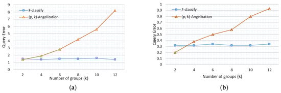 For the Heart Disease and Adults data sets, relative query error is plotted against the number of groups in Figure 6a,b. As the group size in F-Classify is not fixed like it is in (p, k) angelization, the relative query error for different group sizes is almost the same in the proposed approach. Furthermore, in the suggested methodology, fuzzy classification is applied for both QIs and SAs, resulting in a relatively low relative query error as compared to (p, k) angelization. Although enhanced generalization is employed for QIs in (p, k) angelization, query error is still greater than in F-Classify.